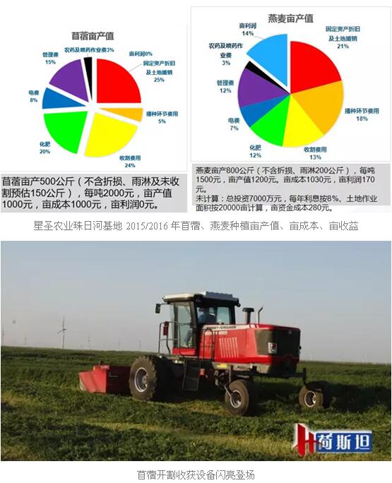 星圣农业公司珠日河基地2015年、2016年苜蓿、燕麦种植亩产值、亩成本、亩收益:按照苜蓿亩产干草500公斤(不含折损、雨淋及未收割预估150公斤),每吨2000元,亩产值1000元,亩成本1000元,亩利润0元。燕麦亩产800公斤(不含折损、雨淋200公斤,折损主要为了适应新道路运输限行规定,收获燕麦时进行切断引起的浪费),每吨1500元,亩产值1200元,亩成本1030元,亩利润170元。未计算:总投资7000万元,每年利息按8%、土地作业面积按20000亩计算,亩资金成本280元。