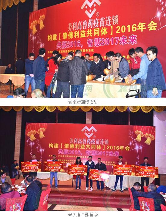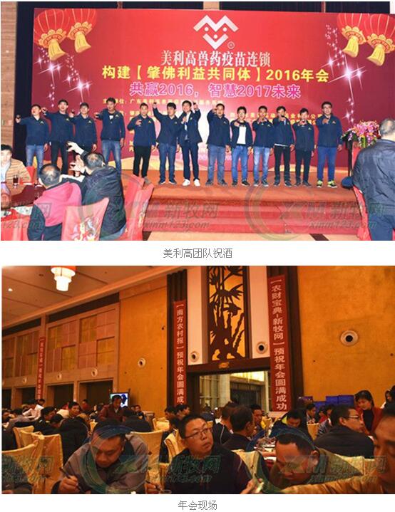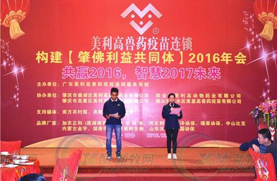 2016年12月31日晚,在这辞旧迎新的时刻,多数人或许在举行各种隆重的跨年活动。然而,《农财宝典》新牧网金牌服务商广东美利高兽药连锁服务系统(以下简称美利高)团队放弃假期,在四会举办构建【肇佛利益共同体】2016年年会,以“共赢2016,智慧2017未来”为主题,总结2016年的相关工作,并对2017年继续深化“肇佛利益共同体”做出部署,养殖户和相关嘉宾近400人参加。