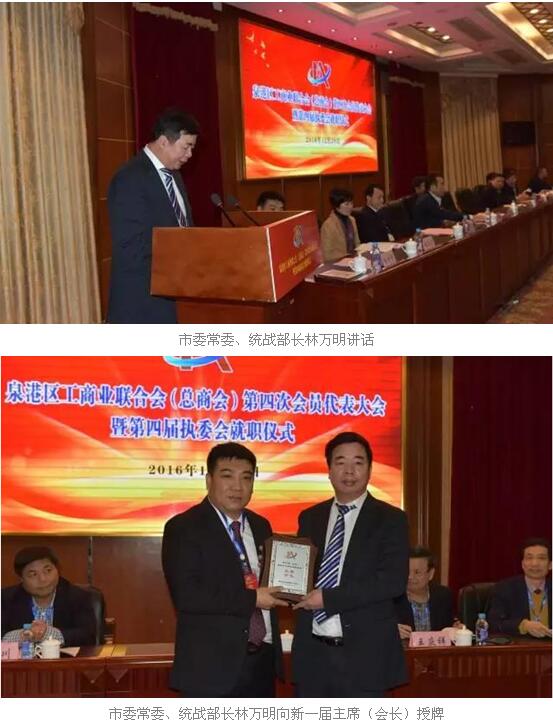 代表大会后随即举行了第四届执委会就职仪式,泉州市市委常委、统战部长林万明亲临会议为泉港区工商联(总商会)主席(会长)颁匾,并对工商联和企业家队伍建设强调了几点意见。要专注实业,不盲目跨界;要致力创新,提高竞争力;要精益管理,努力降低成本提效益;要拓展市场,抢占份额;要有匠心精神,成就百年基业;要坚定信念,跟党走;要守法诚信,守根本;要回报社会,尽责任;要加强学习,提素质。