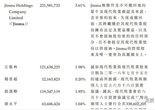 现代牧业上述高管与股东共持有股份564,983,938股,占现代牧业总股份的9.21%。其中Jinmu由高丽娜持股Jinmu约49.12%权益,为实际控制人。完全落实要约,蒙牛及其一致行动人需要持股50%
