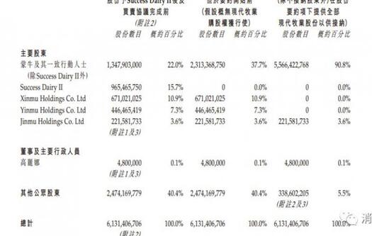 买卖协议完成后,蒙牛(及其一致行动人士)于现代牧业的股权将由约22.0%增 至37.7%,仍 为 单 一 最 大 的 现 代 牧 业 股 东。