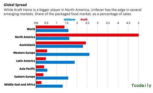 2015 年卡夫与亨氏合并之后,CEO Bernardo Hees 积极削减企业成本、调整企业管理风格,不过欧美消费者对健康趋势的追求令包装食品为重要业务的卡夫亨氏的日子不太好过。虽然他们也进行了相应的调整,比如从配方中去掉人工色素、创造新品牌等等,不过 2 月 15 日公布的 2016 第四季度财报显示卡夫亨氏的净销售额同比下降了 3.7%。虽然因为货币波动、商品价格上涨等原因,最近联合利华在全球新兴市场的业绩不太好,不过与卡夫亨氏相比,他们在这些市场的表现要活跃得多。在包装食品领域,联合利华在拉美及中东&非洲市场的市场份额分别是卡夫亨氏的三倍和四倍。
