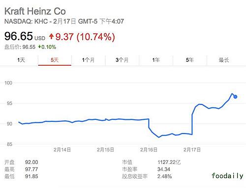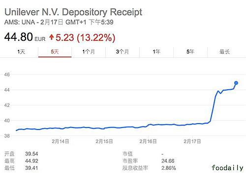 无论如何,资本市场看起来都很期待这次并购。在消息出来之后,联合利华在伦敦的股价上涨了 12.2%,而卡夫亨氏在纽约的股价则上升了 7.3%。