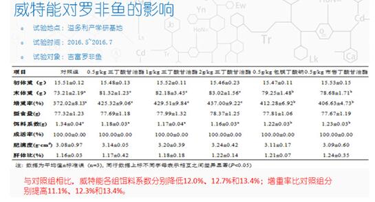 溢多利2017年明星产品——威特能(三丁酸甘油酯)相比(包膜)丁酸钠,具有无臭味、安全性强、纯度高、作用效果显著且稳定等优点;威特能在动物肠道内遇内源脂肪酶后缓慢且有效水解,释放丁酸和甘油,丁酸进入肠道绒毛膜后,作为肠道上皮细胞再生及损伤修复最优异的能量源,可迅速修复受损肠道、提高肠道完整性、维护肠道健康;丁酸除快速为肠道上皮细胞迅速提供能量外,可有效抑制大肠杆菌、弧菌、气单孢菌、沙门氏菌、金黄色葡萄球菌、产气夹膜梭菌等有害菌的繁殖,起到一定的抑菌作用;饲料中添加威特能500g/t以上,养殖动物的肠道绒毛膜高度和吸收面积可增加10%-20%;养殖动物肠道疾病爆发率可减少80%以上,成活率显著提高;同时饲料吸收利用率显著提高,饵料系数可降低0.05以上,动物生长可提高5%以上。