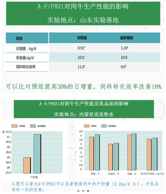 反刍专用复合酶——溢多酶(A-P821、A-F821)是溢多利研发中心经多年科技攻关,采用先进的基因工程、微生物发酵、酶谱筛选、包被等技术,成功研发的反刍动物专用复合酶。其含有的纤维素酶、木聚糖酶、β-葡聚糖酶、淀粉酶、蛋白酶、α-半乳糖苷酶等,显著不同于市场同类产品,表现为复合酶能够很好适应反刍动物胃肠道环境、且能够保证不同酶种分别在瘤胃、真胃、小肠中发挥作用,能提高日粮全消化道营养成分的消化率。经科研院所、试验牧场多次验证,可显著改善瘤胃发酵,提高日粮纤维、蛋白质、淀粉的全消化道消化率,显著提高奶牛产奶量、肉牛和羊的日增重,同时具有提高机体抗应激和改善动物机体健康的功能。