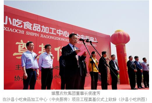 与此同时,在三明高新区金沙园内,雏鹰农牧参与投资建设的沙县小吃食品加工中心(中央厨房)项目工程举行奠基仪式。该中央厨房工程是沙县小吃产业转型升级的重要支撑项目,占地约120亩,欲建成一个集沙县小吃食品研发、食品加工、物流配送为一体的全方位食品企业,全力保障沙县小吃食品安全。