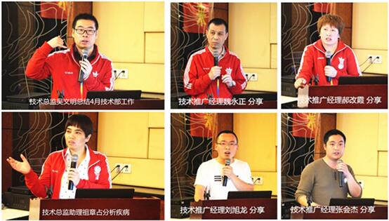 技术部总监吴文明对4月技术部的工作做了总结,并给予了高度的评价。并针对新品“杆菌杀”和“新双胃灵”做了详细的介绍。技术总监吴文明、技术总监助理祖章占和技术推广经理魏永正、郝改霞、刘旭龙、张会杰分别针对本月市场上的流行疾病,从不同的角度分析典型案例。如霉菌毒素、腺肌胃炎、流感、传喉、病毒性呼吸道、沙门氏菌、滑液囊支原体等疾病分别进行详细地剖析,并因病制宜的制定了治疗方案。对下月疾病进行预测和分析,天气逐渐炎热其中法氏囊疾病会成高发态势,在鸡群免疫前后加强使用黄芪多糖口服液预防;肠道、腺肌胃炎、球虫等疾病会呈高发态势,在饲料中添加毒素净、益生态等防止疾病发生;病毒性疾病还会继续侵害鸡群,需重视秋防,忽略春防。