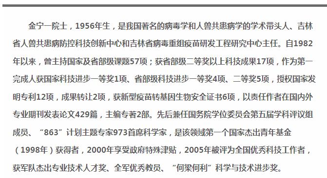 金宁一院士是我国著名的病毒学和人畜共患病学的学术带头人,兽医界第一位国家杰出青年基金获得者,享受政府特殊津贴,获得多项国家、省部级科技进步奖,并曾作为第一完成人荣获国家科技进步一等奖1项、省部级科技进步一等奖4项、二等奖5项,取得12项发明专利的授权。