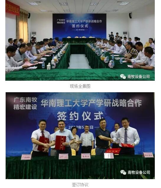 5月3日,广东南牧、精宏建设与华南理工大学机械与汽车工程学院、材料科学与工程学院分别签订产学研战略合作协议。双方将致力于农牧装备的研发与合作,在国家大力推进农业供给侧结构性改革的大背景下,共同推动养殖业的加速转型升级。