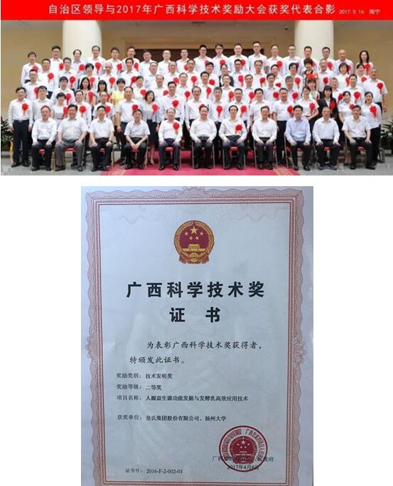 日前,2017年广西科学技术奖励大会在南宁举行。自治区党委书记彭清华出席大会,自治区主席陈武在会上讲话,并共同为获奖代表颁奖。皇氏集团股份有限公司与扬州大学科研团队联合申报的“人源益生菌功能发掘与发酵乳高效应用技术”成果荣获自治区技术发明二等奖。