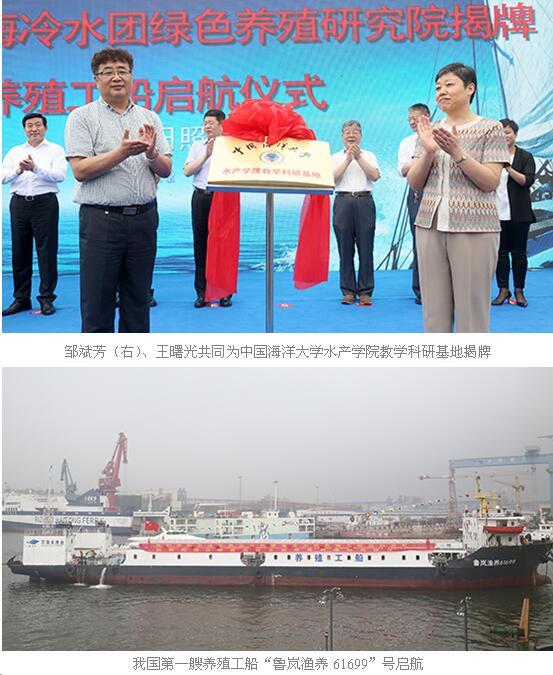 7月2日上午,日照黄海冷水团绿色养殖研究院揭牌暨养殖工船启航仪式在日照港达船厂码头举行。农业部渔业渔政管理局局长张显良,山东省海洋与渔业厅厅长王守信,日照市委书记刘星泰、市长齐家滨、市委副书记邹斌芳,中国海洋大学水产学院教授、黄海冷水团绿色养殖技术研究与产业化项目负责人董双林,水产学院党委书记王曙光、院长李琪、副院长宋协法等出席仪式。