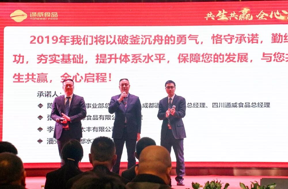 针对食品安全质量,春源食品总经理张有祥在会上表示,保障食品安全质量是食品企业的立身之本,只有食品质量安全过硬,才能为消费者提供健康的日常饮食,才能为渠道合作伙伴提供正当且丰厚的利润。同时,张总还邀请了通威食品事业部总经理助理陈波、新太丰有限公司总经理李天文、成都水产有限公司总经理潘荣忠共同上台,对通威食品水产品、畜禽产品、水产加工产品的质量安全与服务标准向广大通威食品客户做出了保障承诺。