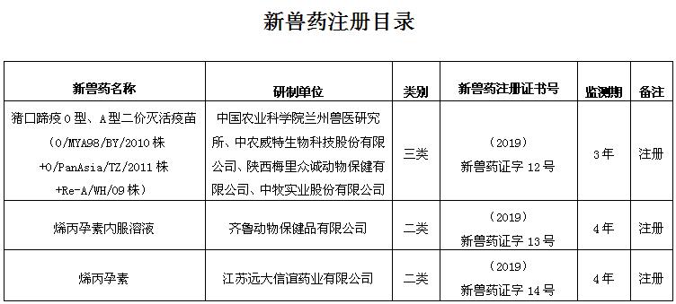 根据《兽药管理条例》和《兽药注册办法》规定,经审查,批准中国农业科学院兰州兽医研究所等6家单位申报的猪口蹄疫O型、A型二价灭活疫苗(O/MYA98/BY/2010株+O/PanAsia/TZ/2011株+Re-A/WH/09株)等3种兽药产品为新兽药,核发《新兽药注册证书》,发布产品试行规程、质量标准、说明书和标签,自2019年3月12日起执行。