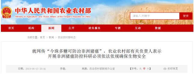 截至目前,农业农村部尚未受理过任何针对非洲猪瘟病毒的预防治疗药物或疫苗,所谓“可以防治非洲猪瘟的今珠多糖注射液”,没有申请兽药注册,有关企业更未取得《兽药生产许可证》。按照《兽药管理条例》规定,完成新兽药(中兽药、化学药品)实验室阶段研究,拟开展临床试验的,其研制单位必须向省级畜牧兽医行政管理部门提交备案材料进行备案。据了解,海南南药研究团队及相关企业迄今并未向海南省农业农村厅提出新兽药临床试验备案申请。根据有关生物安全管理规定,用非洲猪瘟病毒开展有关药物的实验研究,必须向农业农村部提出高致病性病原微生物实验活动审批并获得批准。农业农村部从未收到有关单位的上述申请。在没有使用非洲猪瘟病毒开展动物实验数据的情况下,报道所称“今珠多糖可有效防治非洲猪瘟”缺乏科学依据。