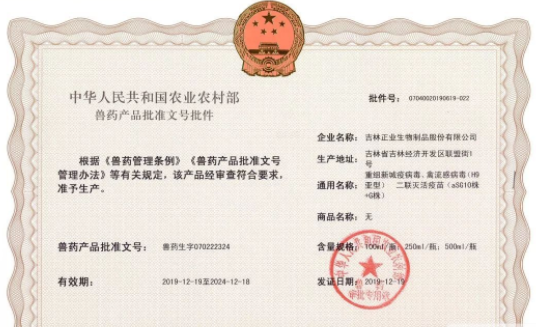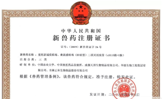 日前,由吉林正业生物制品股份有限公司生产的重组新城疫病毒、禽流感病毒(H9亚型)二联灭活疫苗(aSG10株+G株)喜获农业农村部颁发的兽药产品批准文号。