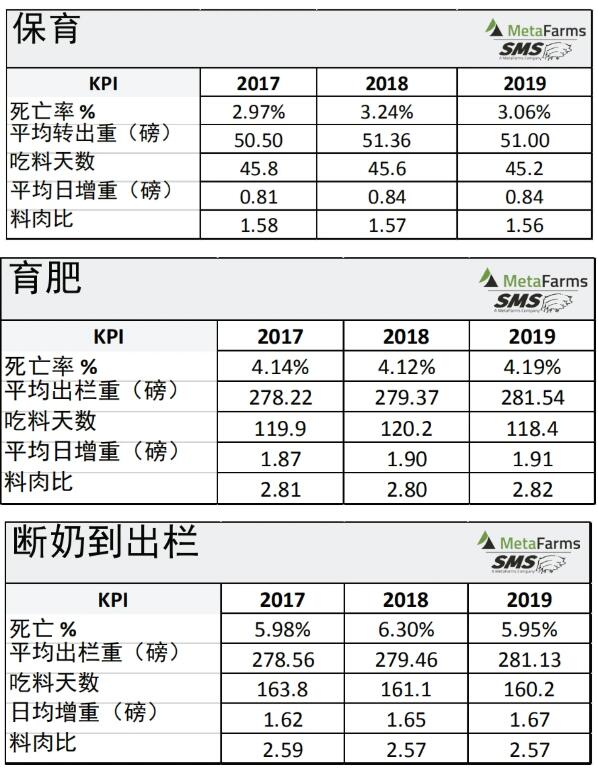 该报告由美国养猪数据公司MetaFarms及子公司SMS具体制作,所用数据为其系统中至少建档3年以上的美国猪场的数据,2019年该数据集涵盖母猪场600个,母猪1,588,246头,保育猪15,666,136头,育肥猪17,479,763头,断奶到育肥猪8,023,610头。