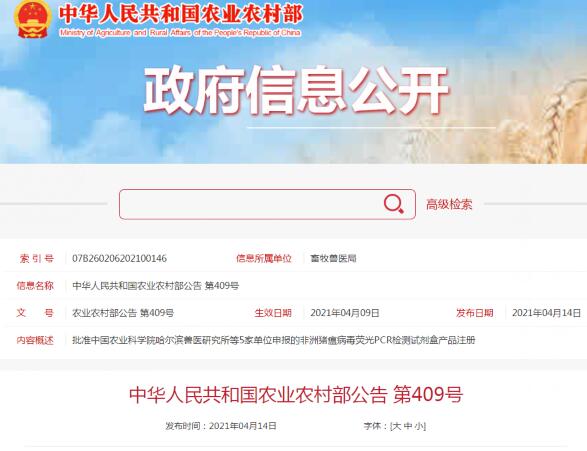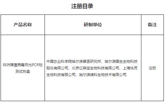 根据《兽药管理条例》和《兽药注册办法》规定,经审查,批准中国农业科学院哈尔滨兽医研究所等5家单位申报的非洲猪瘟病毒荧光PCR检测试剂盒产品注册,并发布产品试行规程、质量标准、说明书和内包装标签。自发布之日起执行。
