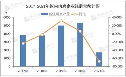 综合来看2020-2021年肉鸡孵化、养殖盈利均处较低水平,业内外对肉鸡关注度下降,肉鸡行业扩张速度放慢,肉鸡企业新注册量减少。