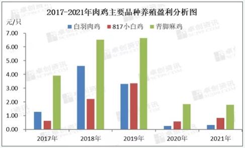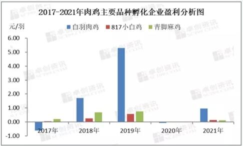如图2所示,2017-2021年肉鸡主要品种孵化企业盈利情况呈先增后减趋势,2019年白羽肉鸡、817小白鸡、青脚麻鸡孵化盈利分别高达5.30元/羽、0.56元/羽、0.76元/羽,同比涨幅208.14%、133.14%、11.76%。2020年肉鸡市场急速下滑,孵化企业场多有亏损,白羽肉鸡、青脚麻鸡分别亏损0.08元/羽、0.02元/羽,817小白鸡孵化企业成本线盘整。2021年肉鸡市场略有好转,白羽肉鸡、817小白鸡、青脚麻鸡盈利仅为0.95元/羽、0.14元/羽、0.11元/羽。2021年孵化企业盈利水平虽有好转但程度有限。