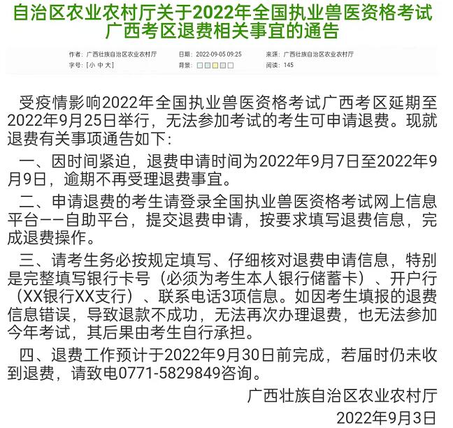9月3日,广西发布通告称,受疫情影响,2022年全国执业兽医资格考试广西考区延期至9月25日举行,无法参加考试的考生可申请退费。