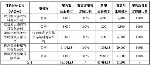 唐人神:拟对5家子公司合计新增注册资本4.29亿元