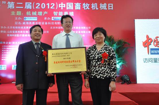 外商独资青岛爱基饲料公司研发的自助式冷制粒连锁模式无可置疑地荣获“养殖场饲料制粒最佳解决方案”大奖。汪尧春博士代表公司,由中国农业大学畜牧工程学分别会、畜牧工程委员会李保明理事长授予奖牌与奖状。
