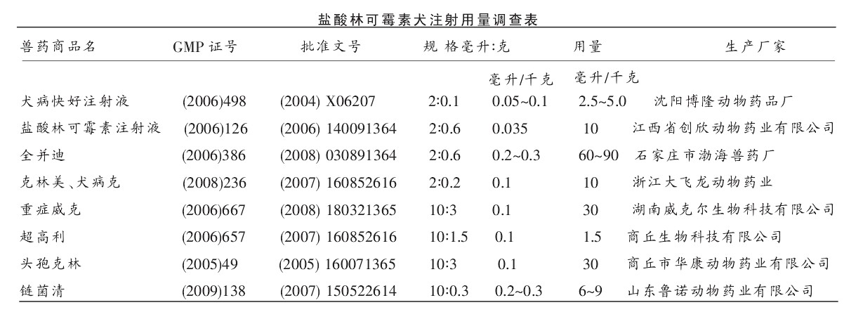 笔者在保定市清苑县城兽药经营单位和兽医诊所,对盐酸林可霉素犬注射用量进行了调查。 经查8 家生产企业不同商品名称的兽药, 通用名为盐酸林可霉素注射液,主要成分都是盐酸林可霉素。