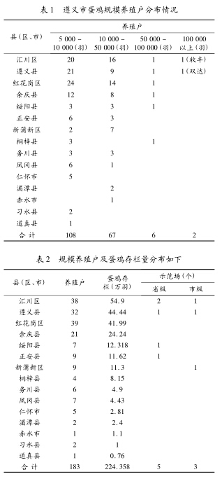 为加快遵义市蛋鸡业发展,推进蛋鸡规模养殖场标准化建设进程,了解蛋鸡养殖现状,促进蛋禽养殖在“十二五”期间合理化布局,确保禽蛋产品质量安全和有效供给,笔者对遵义市规模化蛋鸡养殖现状进行了摸底调查,现报道如下。