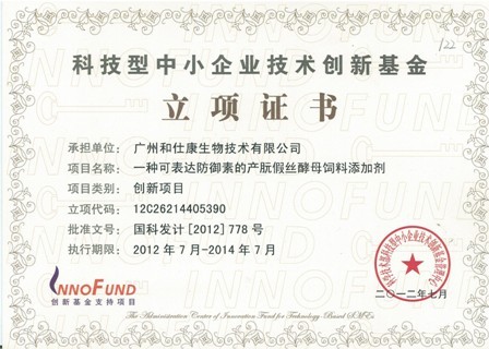 近日,国家科技部公布了“2012年度科技型中小企业技术创新基金立项项目”名单,广州和仕康生物技术有限公司的“一种可表达防御素的产朊假丝酵母饲料添加剂”研发项目名列其中,获得了国家创新基金无偿资助。