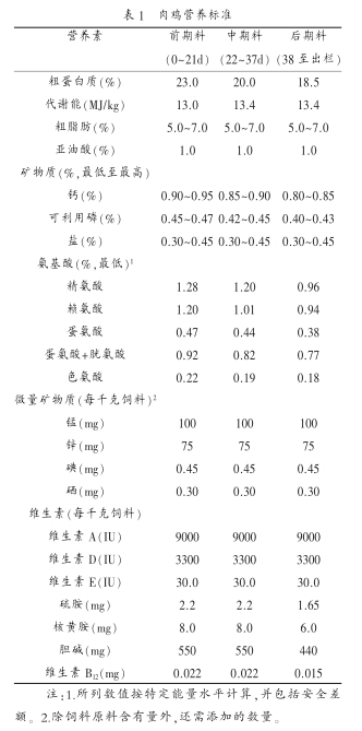 肉鸡要求高能高蛋白水平的饲料,各种养分齐全、充足且比例平衡。 任何微量成分的缺乏都会使鸡出现病理状态。 各种肉鸡营养需要量有所不同,但大同小异,按生长阶段可参照以下标准执行表 1。