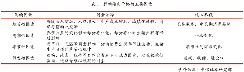 我们对猪价的研究框架,包含四大因素:趋势因素、周期因素、季节因素、偶发因素。其中,趋势性因素长期影响猪价重心移动;周期性因素导致价格中期波动;季节性因素是需求和供应在 1 年内发生规律性变化的主因;偶发性因素通常只能引起短期的影响,影响程度较大的偶发性因素也只是延后周期,而不能扭转周期。