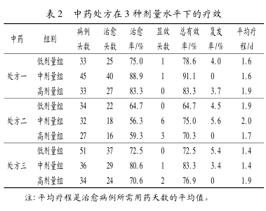 经卡方检验 , 处方一中剂量组的治愈率与处方二的 3 种剂量组的治愈率比较均差异极显著(P <0.01),与处方三低剂量组、 高剂量组的治愈率比较差异显著(P < 0. 05);处方一中剂量组、 处方二高剂量组和处方三高剂量组的复发率均为 0 。处方三低剂量组、 中剂量组的平均疗程最短, 约 1. 4 d, 但两组的治愈率和有效率均低于处方一中剂量组。综合分析,处方一的中剂量为最适用药剂量。