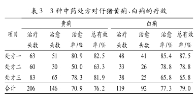 综合分析, 中药对仔猪黄白痢的疗效优于抗生素, 复发率低于抗生素;3 种处方中, 处方一的疗效最佳。