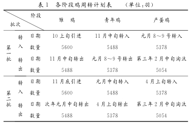 雏鸡的生产周期必须与专用种鸡场鸡苗生产周期相对应,全年两批育雏,鸡苗引进时间要与开产日龄和产蛋高峰期避开炎热的夏季、产蛋总量、淘汰鸡市场行情、鲜蛋市场行情、育雏适宜的季节等综合因素全面考虑,各阶段鸡周转计划见表1。说明:(1)转入第一批雏鸡与第二批雏鸡之间清洗消毒5~7d。(2)由于第二批雏鸡转入青年鸡舍时间为元月中旬,因此第一批青年鸡必须提前转出。(3)产蛋10个月死淘率6%,其中,8、9月份为1%,其余8个月为0.5%。雏鸡成活率为98%,青年鸡成活率为98%。(4)第一批产蛋鸡日龄480d左右,第二批产蛋鸡日龄为420d,两批产蛋鸡平均产蛋日龄为450d。
