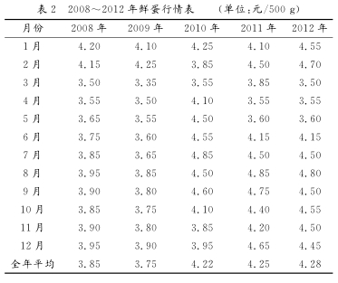 5.1 全年鲜蛋行情(2008~2012年)由此可见,近5年鲜蛋市场行情显示:(1)全年12个月中蛋价最低的月份为3月份,也就是春节过后,一方面市民节日期间物质和营养储备,另一方面土鸡蛋大量投入市场。这期间两批鸡群处于育成期。(2)鲜蛋较低的月份主要为3、4、5月份,这期间第一批鸡刚进入产蛋期,第二批鸡处于育成期,基本上避开了产蛋期和产蛋高峰期。(3)全年鲜蛋行情较高的月份为春节前的1、2月份和炎热夏季8、9月份,这期间第一批鸡产蛋高峰期是4~7月初,完全避开炎热的夏季;第二批鸡产蛋高峰期为5月中旬至8月中旬,基本上避开了炎热的夏季。一方面保证两批鸡的产蛋相对集中在全年蛋价好的时期,另一方面确保了产蛋高峰期的产蛋,也就是确保两批鸡产蛋总量。