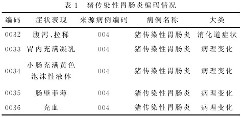 根据我们搜集到的病例,并结合兽医专业教材上的常见疾病,我们总共在数据库中录入了100种疾病,这100种疾病是根据课题组成员反复论证后最终得到的结果。在完成了动物种类的动物疫病总之后,接下来最重要的一步就是对每一种疾病的症状和病变进行编码,也就是建立数据库。下面以猪传染性胃肠炎为例来介绍一下编码的情况(见表1)。