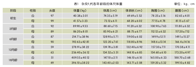 由表1可知,西门塔尔牛作为著名的乳肉兼用牛品种,其F1代显现出较强的杂种优势,6月龄后生长发育较快,其体重和体尺指标达到或接近纯种西门塔尔牛,用德系西门塔尔牛改良科尔沁牛,能显著提高其杂交后代的生产性能。