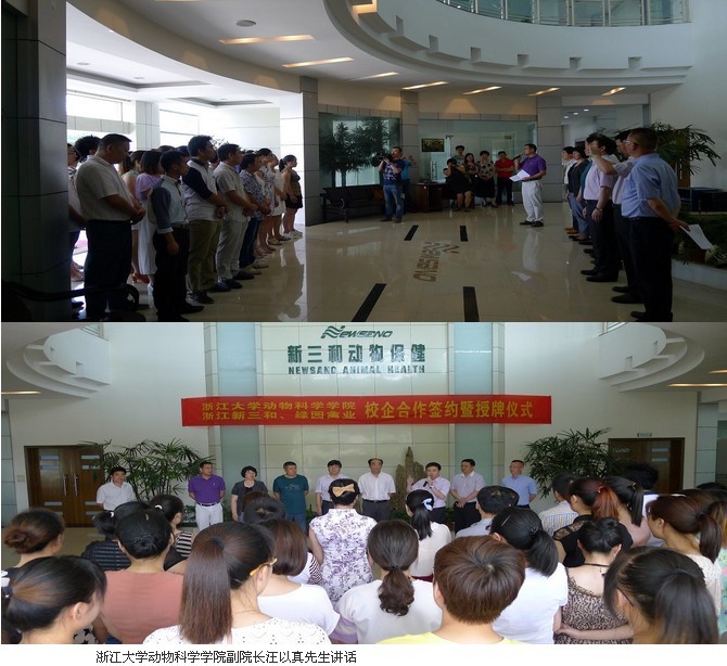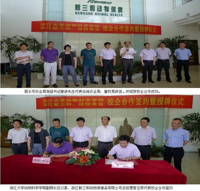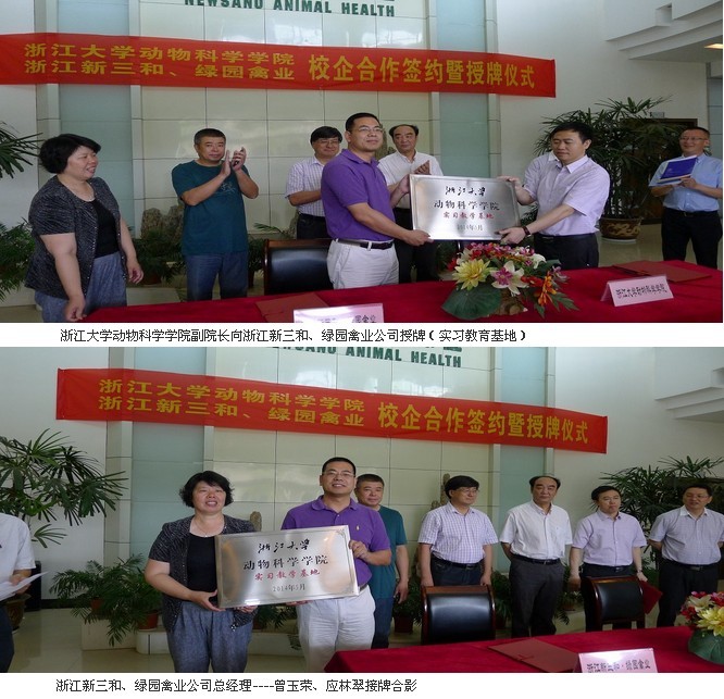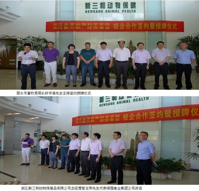 6月9日,浙江大学动物科学学院与浙江新三和、绿园禽业在丽水市绿园禽业集团公司举行了校企合作签约及授牌仪式。浙江大学动物科学学院副院长汪以真先生、丽水市农业局书记姜波先生、浙江新三和动物保健品有限公司总经理曾玉荣先生分别在签约仪式上讲话。浙江大学动物科学学院、丽水市农业局、畜牧局相关部门领导及新三和、绿园禽业全体管理人员参加了签约授牌仪式。