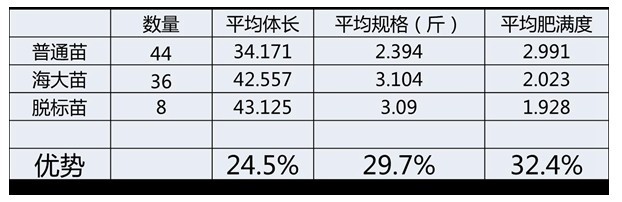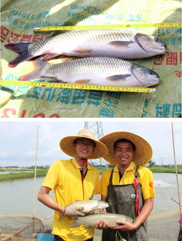 现场项目组人员将百容鱼苗与本地鱼苗的体型、体长、体重、肥满度以及生长速度等方面进行了对比,结果显示在同一个塘里,运用同样的投喂方式及管理方法,两种苗种的体型产生了鲜明对比。