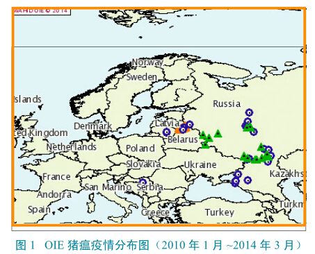 2010年以来,猪瘟疫情逐渐平息,除立陶宛之外,英、德、法、意、斯洛伐克等欧盟诸国没有发生猪瘟疫情。2011年5~7月,立陶宛的KAUNAS的家猪群体发生了5起疫情,一共扑杀38731头家猪。目前,除野猪群体尚有猪瘟流行外,家猪疫情已经获得有效控制(图1)。
