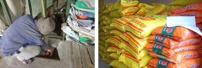 蹲在地上,佝偻着腰,两手不停地将玉米扒拉到提升机的入口处;提升机将玉米原料送入粉碎机粉碎,粉尘飞扬;大热天的,还戴个帽子,粉尘落在帽子上、衣服上、裤子上、脚背上、鞋子上,全身上下都沾满了粉尘——这就是陈水根在做自配料时,记者抓拍下的一个镜头。
