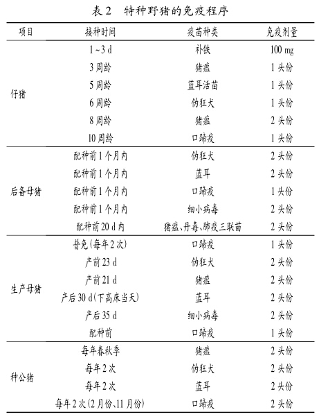 保持猪舍内清洁干燥,每周用消毒灵、消毒威、异酸氰氨等消毒剂消毒3~4次,每周对周围环境消毒2次;定期驱虫,怀孕母猪于产前20~30d用抗寄生虫药1次,配种前再用药1次。公猪每年至少用药2次,但感染严重的养殖场,每年应用药4~6次;仔猪20日龄用药1次,80~90日龄用药1次;后备母猪配种前用药1次,新买小猪驱虫2次,间隔10~14d。加强疫病防治,通过疫病监测,规范制订免疫程序(见表2),可有效降低特种野猪的发病率和死亡率。