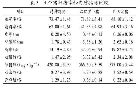 经过对特种野猪、江口萝卜猪和外三元猪进行屠宰测定和肉质检测分析(见表3),结果表明:特种野猪的屠宰率和瘦肉率高,分别为73.47%、67.00%;胆固醇、粗脂肪和脂率低,分别为420.80mg/kg、1.47%、13.19%,分别是外三元猪肉的72.93%、62.82%、35.59%,分别是江口萝卜猪肉的74.28%、43.62%、66.38%。亚油酸和亚麻酸含量高,每百克脂肪酸中分别含8.27g、1.29g,分别是外三元猪肉的2.35倍、5.86倍,分别是江口萝卜猪肉的2.58倍、3.39倍。与传统养殖的特种野相比,其屠宰率、瘦肉率分别提高1.17%、2.40%。
