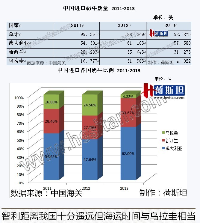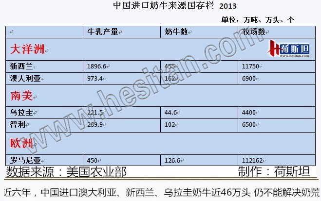智利奶牛养殖业发达,根据智利IDF国家委员会报告,截止2013年底,智利成乳牛102万头,牧场数达6500个。2013年度,智利牛乳产量269.9万吨,占全球总产量的0.4%。2011-2013年,中国共从乌拉圭进口奶牛约5万头,与乌拉圭相比,同处于南美洲的智利奶牛数102万头,超过乌拉圭一倍,牛场数远远多于乌拉圭。