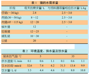 表1是猪所需水量的一览表。随着猪的成长,其对饮水的需要量也在增加。对肥育猪而言,每采食1kg饲料需要3L的饮水。对肥育猪来说,不管是哪个生长阶段,都需要采食量约3倍的饮水量。另外,对哺母乳猪来说,由于乳汁的形成需要较多的水分,因此饮水的需求量也变高。哺乳的仔猪数增多,对饮水的需求也随之增加。如果此时水分不足,对母乳的生产也会有影响,因此需要特别注意。