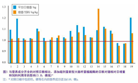在日粮中以超过500FTU/kg的剂量添加新型、天然耐热的大肠杆菌植酸酶,能引起植酸大量的水解。与营养适宜的对照日粮相比,超剂量(1000~2500FTU/kg)使用这种新型的大肠杆菌植酸酶,能使猪的平均日增重增加7%,饲料利用率(增重:饲料)增加4%(图3)。在19项超剂量试验中,平均日增重提高约为84%,饲料增重比增加为74%。对照日粮中包括钙、磷等在内的营养成分适当(1.0;红线)。