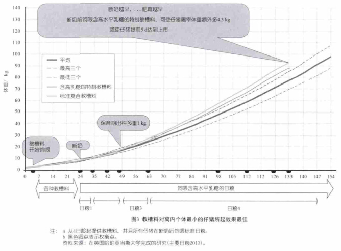 研究表明,组成较为复杂的日粮能提高仔猪教槽料的采食量、窝内采食的仔猪数和断奶前的生长速度。研究还表明,含有高水平乳制品的教槽料,在提高仔猪断奶前和断奶后生产性能上,较普通的复合饲料(含15%~20%的乳糖)更有效(图3)。这一好处会贯穿仔猪的一生,使得仔猪的生产具有很高的成本效益。