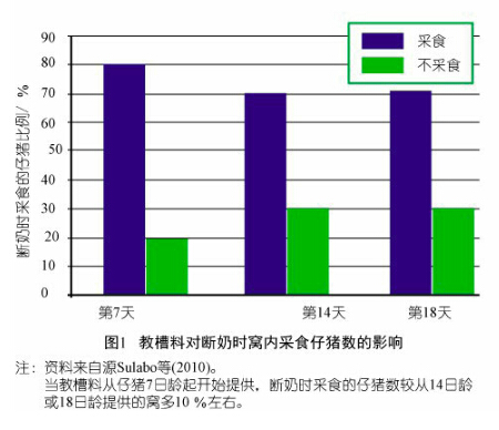 研究表明,仔猪教槽料提供得越早,到断奶时采食仔猪所占的比例越大。当教槽料从7日龄起开始提供时,到断奶时窝内采食的仔猪比例比从14日龄或18日龄起开始供应教槽料的窝约多10%以上(图1)。要获得最理想的效果,强烈建议从大约4~7日龄起提供高质量的教槽料。