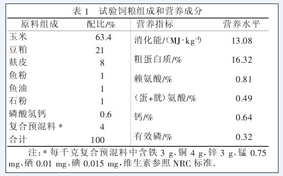 生长肥育猪饲养试验饲粮由浙江国茂饲料有限公司提供,基础饲粮参考美国NRC(1998)标准配置,具体配方及营养成分见表1。