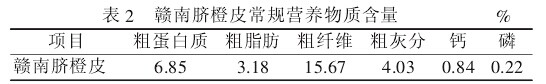 由表2可知,赣南脐橙皮的粗蛋白质、粗脂肪含量较低,分别为6.85%和3.18%;粗纤维和钙含量较高,分别为15.67%和0.84%。